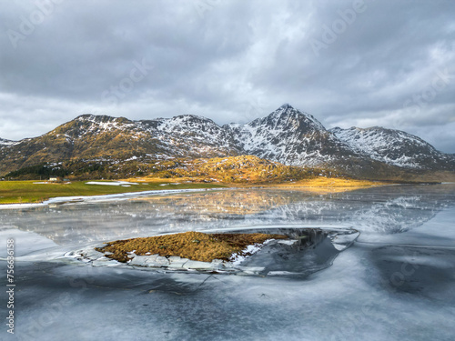 Reflective waters and rugged peaks create a dramatic natural scene in this mountainous winter terrain.
