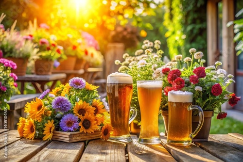 beer, garden, summer, refreshment, drink, alcohol, glasses, table, flower, sunflower, sunny, wooden, relaxation, celebration, party, beverage, brew, lager, ales, floral, nature, still life, oktoberfest, picnic, deck, patio, wood, bright, gold, warm, leisure, day, sunlight, plant, blooming, blossom, red flower, white flower, potted plants, wooden table, summer day, gathering, social, festive, sunny day