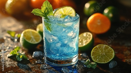Refreshing blue cocktail with lime and mint on wooden table, surrounded by citrus fruits