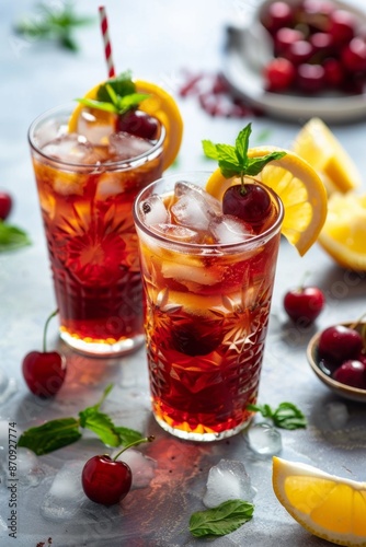 Refreshing Cherry Drink in Glass with Ice Cubes. Cherry Pie Iced Tea