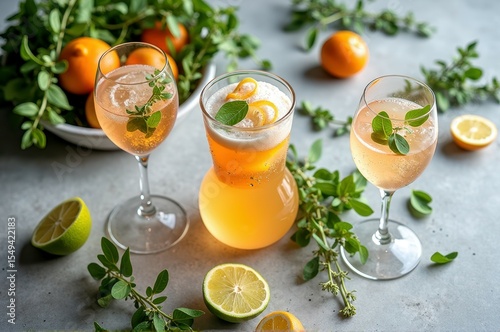 Refreshing citrus beverages with fresh garnishes on a stone table setting