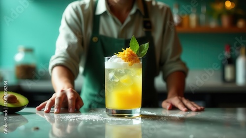 Refreshing citrus cocktail garnished with zest and herb, presented by a bartender on a clean surface
