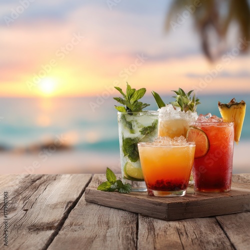 Refreshing Cocktails on a Wooden Table at Sunset Beach.