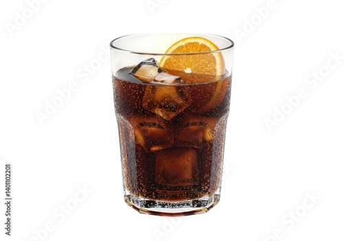 cola, beverage, drink, refreshment, glasses, ice, cube, orange, slice, fizzy, sweet, soda, cold, liquid, transparent, citrous, summer, isolated, white, background, delicious, thirst, quench, carbonated, clear, fruit, cool, fresh, brown