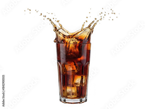 Refreshing cola splash ice cubes drink high speed photography studio shot
