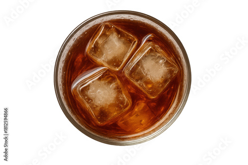 Refreshing cold dark beverage with ice cubes in a glass, top view, transparent background for summer hydration