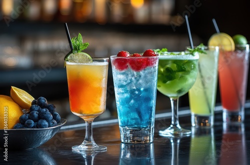 Refreshing Colorful Cocktails in Stylish Glasses on a Bar Counter Surrounded by Fresh Fruits and Mint Leaves in a Vibrant Cocktail Setting