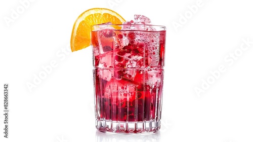 Refreshing cranberry orange cocktail with ice in glass on white.