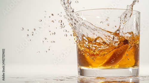 Refreshing drink splashes in a glass with ice and citrus slice during sunny midday hours