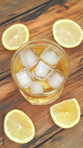 Refreshing Drink with Ice and Lemon Slices - Illustration