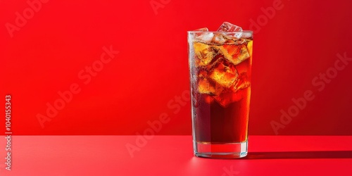 Refreshing drink with ice cubes on vibrant red background.