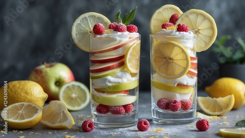 Refreshing Fruit Dessert Glasses with Apple, Lemon, and Raspberries for a Healthy Summer Snack and Refreshment Idea.