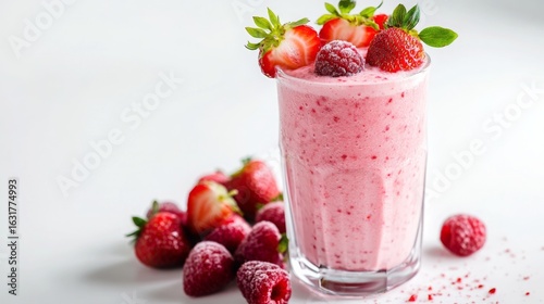 Refreshing fruit smoothie with strawberries and raspberries served in a clear glass on a bright surface