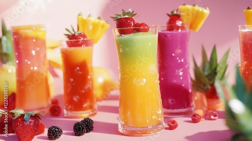 fruit, drink, beverage, tropical, summer, fresh, delicious, healthy, colourful, strawberry, pineapple, orange, mango, banana, kiwi, lime, lemon, raspberry, blackberry, glasses, ice, pink, green, red, purple, yellow, food, diet, vitamin, nature, lifestyle, epicure, refreshing, cold, sweet, tasty, deliciously