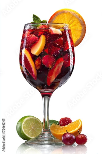 drink, cocktail, sangria, refreshment, fruit, beverage, summer, vibrant, colourful, wine, mix, red, delicious, mixed, blood-red, refreshing, fruit juice, iced, sweet, tart, citrous, lime, lemon, orange, apple, peach, strawberry, raspberry, cherry, mint, glasses, stemmed, isolated, white, background, closeup, food, composition, juicy, slice, seasonal, healthy, alcoholic, nonalcoholic, tropical