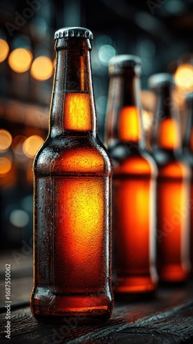 Refreshing golden bottles filled with beer glisten in a warm, inviting brewery atmosphere during an evening gathering