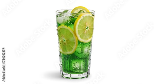Refreshing green drink with lemon slices and ice cubes on a white background