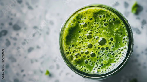 Refreshing green smoothie in a glass jar ready for healthy consumption on a bright morning