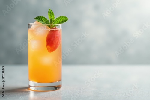 Refreshing Iced Beverage with Peach and Mint Garnish in a Tall Glass