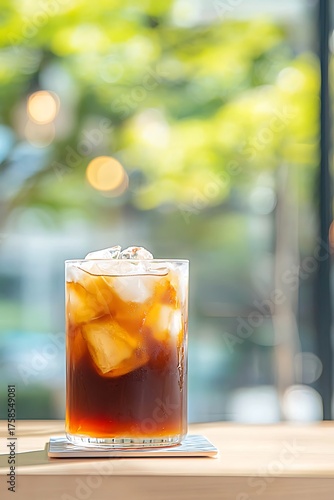 Refreshing Iced Coffee with Ice Cubes on Wooden Table with Soft Focus Background and Natural Light Effects