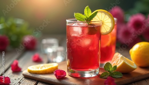 Refreshing iced hibiscus tea with lemon and mint on rustic wooden board. Cold red lemonade, summer drink in glasses with ice, citrous slice and herb leaf.