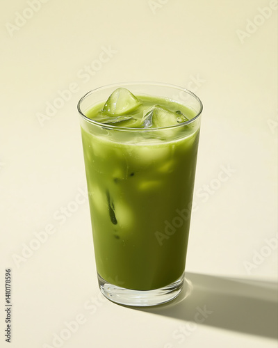 refreshing iced matcha drink in clear glass is set against soft yellow background, creating minimalist and calming atmosphere. vibrant green color of matcha stands out beautifully