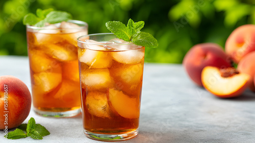 refreshing, iced, peach, tea, garnish, mint, leaf, serve, clear, glasses, fresh, nearby, white, drink, cold, beverage, fruit, summer, sweet, fragrant, aromatic, taste, thirst, quencher, transparent, vessel, liquid, natural, stone, table, background, beautiful, closeup, studio, isolated, healthy, delicious, smooth, bright, simple, elegant, clean, single, component, brown, light, gold