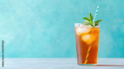 Refreshing iced tea glass with mint leaves and straw against blue background