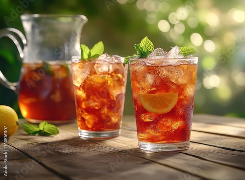 Refreshing Iced Tea with Mint and Lemon Served in Glasses on a Rustic Wooden Table in a Sunlit Outdoor Setting