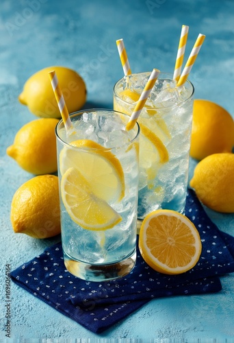 lemon, drink, refreshing, ice, glasses, slice, straw, beverage, summer, yellow, citrous, fruity, cold, sweet, party, table, blue, surface, clean, bright, tasty, refreshment, homemade, dining, treat, receipe, thirst, hydratation, ingredient, serve, garnish, chill