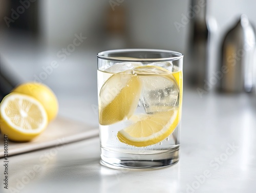 Refreshing lemon water in a glass, kitchen setting