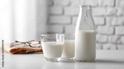 Refreshing Milk in Glass Bottle and Tumblers on White Tabletop