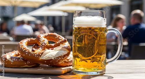 Refreshing Oktoberfest Beer and Salty Pretzels on a Sunny Day at an Outdoor Beer Garden