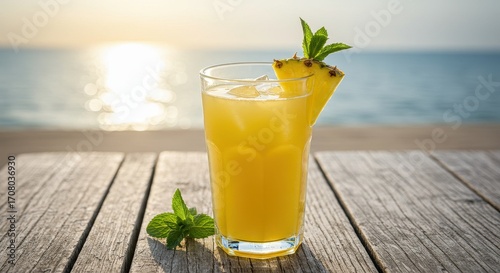 Refreshing Pineapple Drink on Table by the Beach During Sunset with Beautiful Ocean View