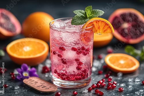 cocktail, pomegranate, citrous, drink, refreshing, summer, ice, mint, fruit, beverage, pink, seed, slice, glasses, garnishing, cold, carbonated, fizzy, liquid, red, orange, grapefruit, food, photo, delicious, tasty, healthy, sweet, tart, juicy, sparkling, bubble, cool, vibrant, colours, background, table, dark, leaf, flower, decor, still, life, closeup, image, style, design, fresh, clean