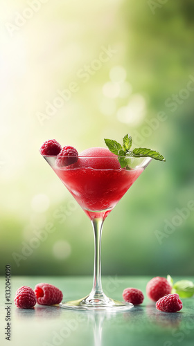 Refreshing Raspberry Sorbet in Elegant Martini Glass with Mint Leaves on Light Green Bokeh Background – Gourmet Dessert and Summer Treat Concept
