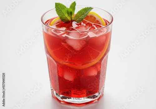 red, drink, cocktail, iced, refreshing, beverage, glasses, cube, lemon, slice, mint, leaf, garnish, summer, fruity, cold, clear, photo, studio, shot, isolated, white, background, thirst, quenching, hibiscus, tea, cranberry, juice, raspberry, strawberry, punch