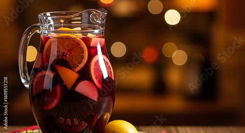 Refreshing Sangria in a Pitcher with Citrus Fruits on a Warm, Festive Background
