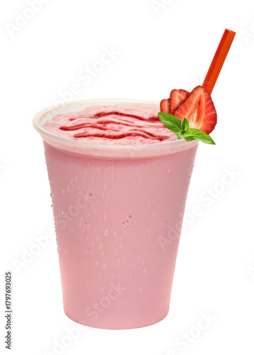 Refreshing Strawberry Smoothie in Plastic Cup Isolated on Transparent Background Fruity Drink with Garnish Cold Beverage Summer Treat Healthy Choice Delicious