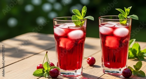 Refreshing Summer Beverage: Two Glasses of Cherry Drink with Ice and Mint on Wooden Table, Perfect for a Sunny Day.