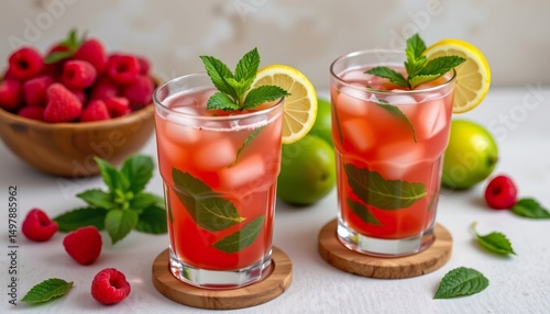 drink, beverage, cocktail, summer, raspberry, mint, lemon, ice, refreshment, still life, garnish, fruity, sweet, tradition, leisure, party, celebration, glasses, food, favor, vibrant, healthy, nature, ingredient, bar, receipe, seasonal, aesthetic, bright, colourful, closeup, texture, freshness, home, craft, kitchen, rustic, table, relaxing, style, hydratation, enjoyment, epicure