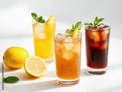 refreshing summer cocktails, vibrant lemonade and iced coffee arranged artistically on a bright white backdrop, evoking a cheerful and relaxed mood perfect for warm days