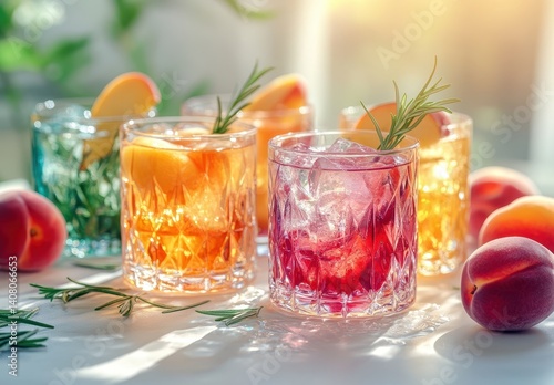 cocktail, drink, summer, fruit, herb, crystal, goggles, sunlight, vibrant, refreshing, peach, mint, ice, garnish, rosemary, bar, table, colourful, beverage, party, celebration, ingredient, atmosphere, tropical, tasty, luxury, topview, still life, sweet, fresh, lifestyle, home, enjoyment, friendship, puckered, toast, beautiful, nature, healthy, hydratation, relaxation