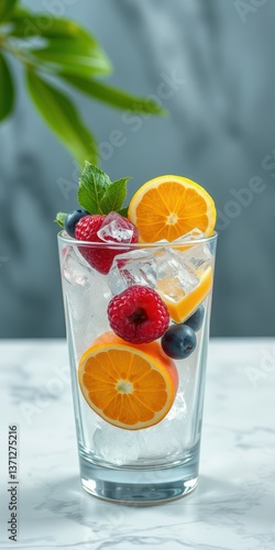 Refreshing summer drink with colorful fruits and ice arranged in a tall glass on a marble surface