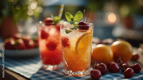 Refreshing summer drinks with fruit and mint in clear glasses on a checkered tablecloth, surrounded by cherries and apricots outdoors.