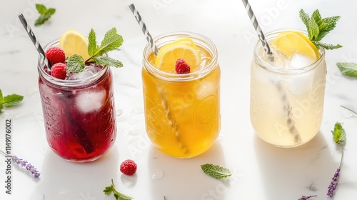 drink, lemonade, iced, beverage, summer, refreshing, lemon, raspberry, mint, mason, jar, glasses, straw, ice, cold, fruit, citrous, berry, leaf, green, yellow, red, white, background, table, surface, photo, food, healthy, tasty, delicious, sweet, natural, organic, homemade, party, celebration, summer