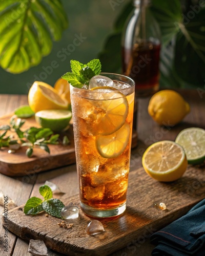 iced, tea, refreshing, tall, glasses, ice, cube, lemon, slice, mint, leaf, wooden, cutting, board, fresh, rustic, table, soft, natural, lighting, green, warm, tone, beverage, photo, summer, drink, citrous, fruit, cosy, atmosphere, high, detail, food, styling, shallow, depth, elegant, epicure, hydrating, bright, crisp, indulgent, artistic