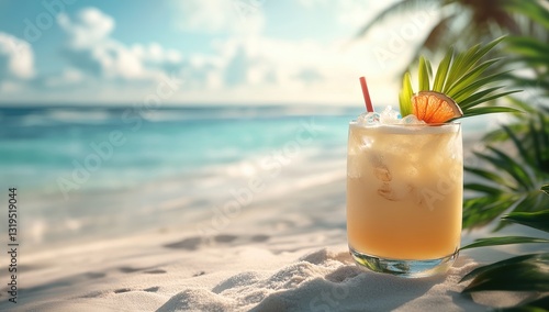 Refreshing Tropical Cocktail with a Slice of Orange on Sandy Beach with Ocean Waves in Background Under a Bright Sunny Sky