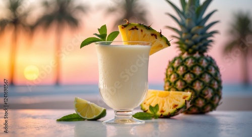 Refreshing Tropical Pineapple Yogurt Smoothie at Sunset with Lime and Whole Pineapple
