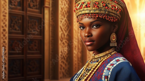 woman, vibrant, regal, traditional, ceremonial, elegant, pose, cultural, heritage, tradition, beautiful, identity, pride, grace, empowerment, artistic, decorative, luxury, vintage, art, ethnic, culture, building, wall, door, pattern, headpiece, necklace, gold, decor, jewellery, colourful, bead, fabric, texture, inspiration, mystique, craftsmanship, shine, classic, presence